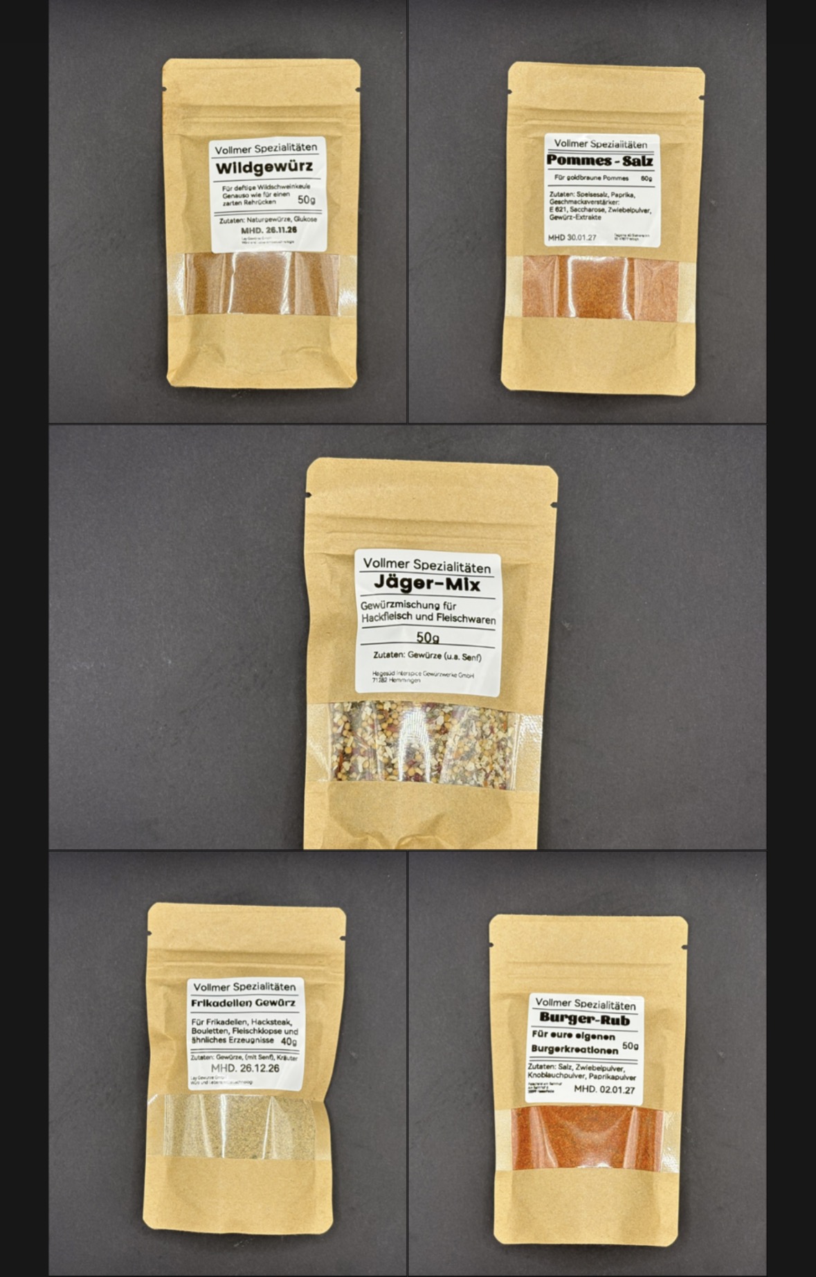 5 kräftige Gewürzmischungen in einem Set für echte Geschmacksliebhaber: würziges Pommes Salz, aromatischer Jäger Mix, intensives Wildgewürz und herzhafter Burger & Frikadellen Rub. Perfekt für Grill, Pfanne und Küche – vielseitig einsetzbar und ideal zum Verfeinern von Fleisch, Wild und Beilagen. Ein Bundle für alle, die es kräftig und ehrlich mögen.