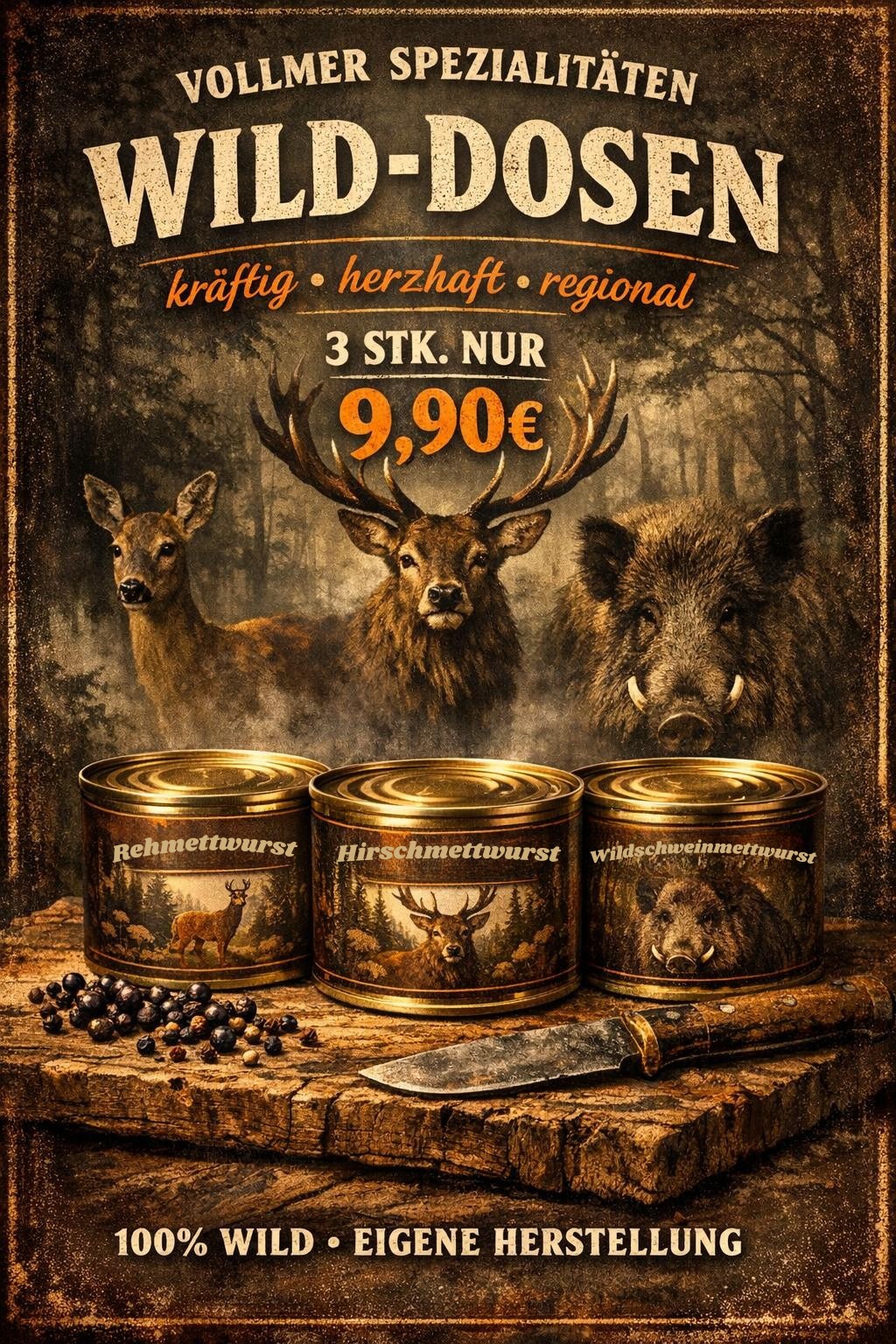 Zutaten: 70% Wildschweinfleisch, 20% Schweine-fleisch/Speck, Fleischbrühe, Nitritpokelsalz (Kochsalz, Konservierungsstolf E250), Gewürze.