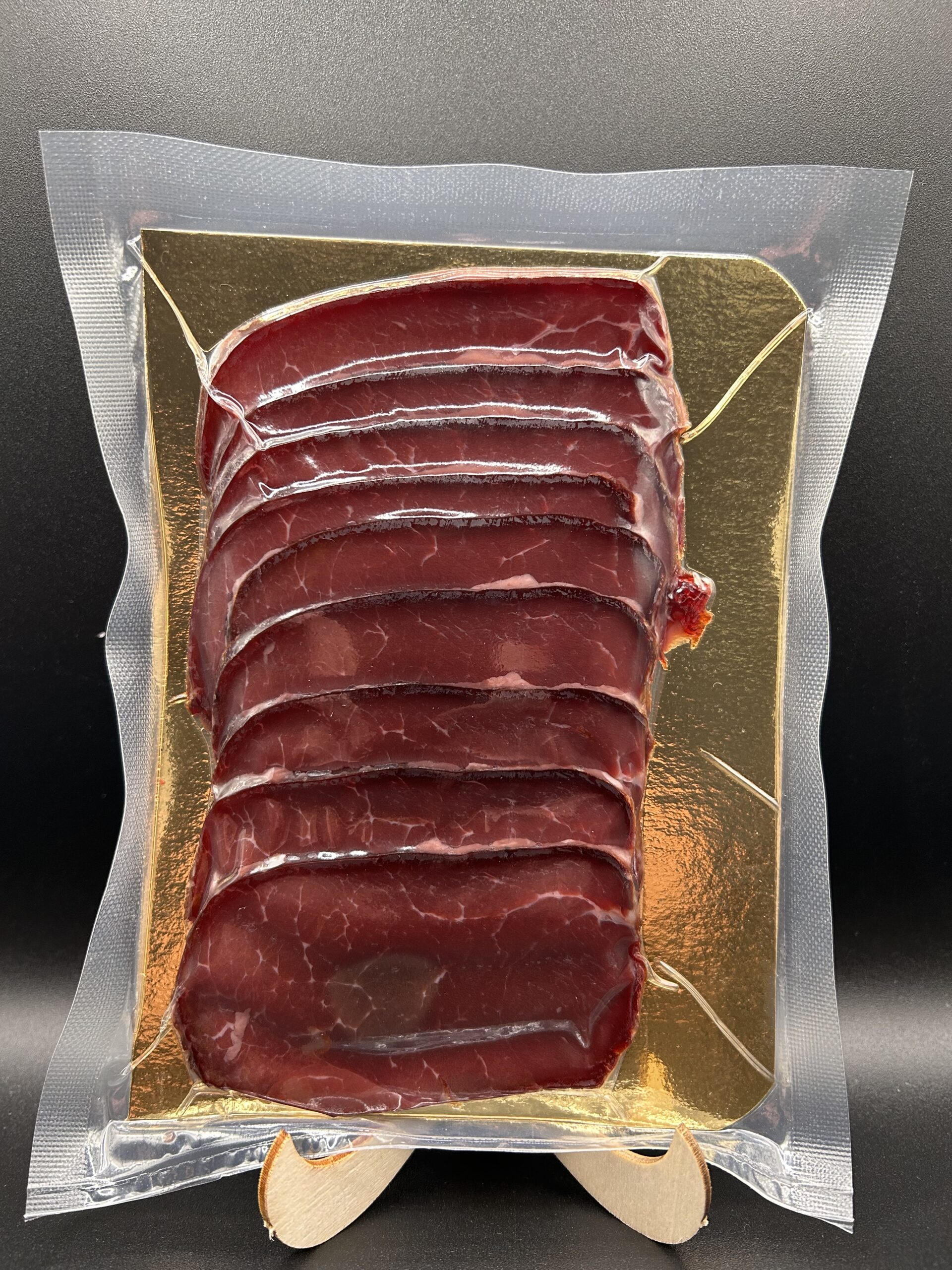 Hergestellt aus sorgfältig ausgewählten Edelteilen der Wildschweinkeule, besticht dieser Schinken durch seinen mild-aromatischen Geschmack und seine zarte Textur. Die traditionelle Handwerkskunst, kombiniert mit einer behutsamen Reifung, verleiht ihm sein unverwechselbares Aroma.